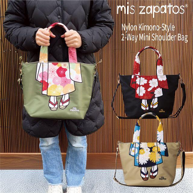 鮮やかな花柄着物が目を引く、ナイロン生地ショルダーバッグ。