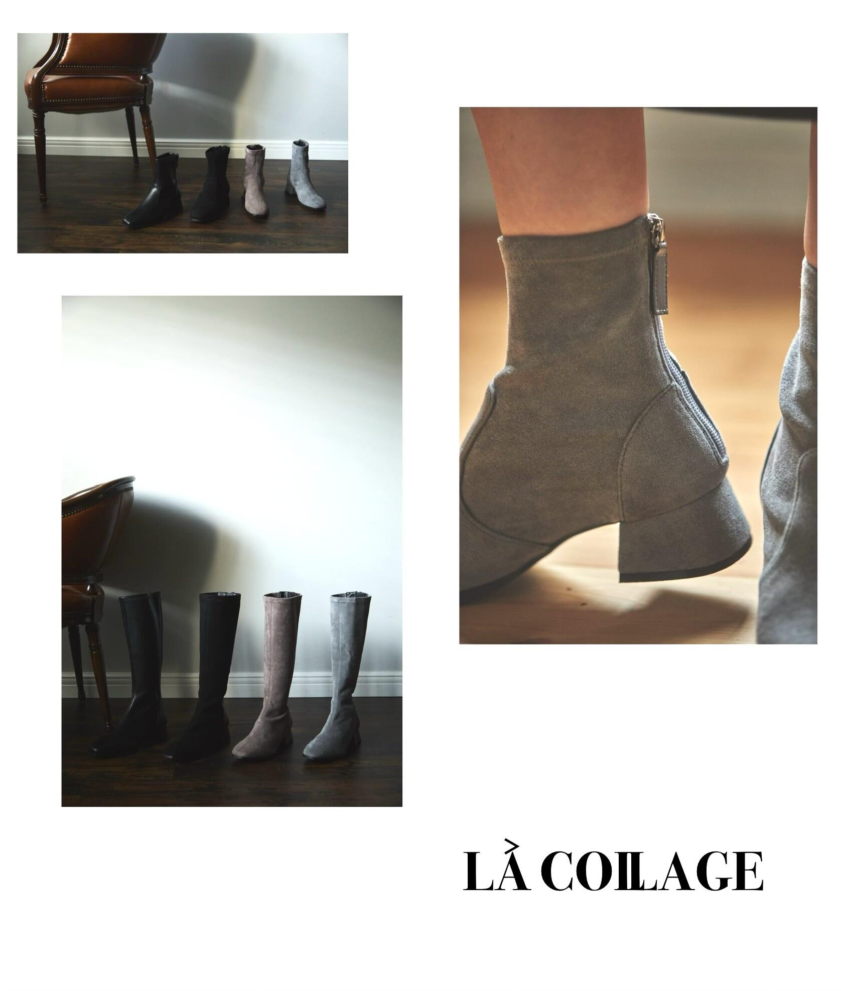 フェイクレザーを使用し、ストレッチ機能を持たせたブーツ。 バックファスナー付きで着脱も楽にしていただけます。足首を美しくみせる筒丈と筒周りのシルエットはフェミニンなスタイルにも相性ぴったりです。
