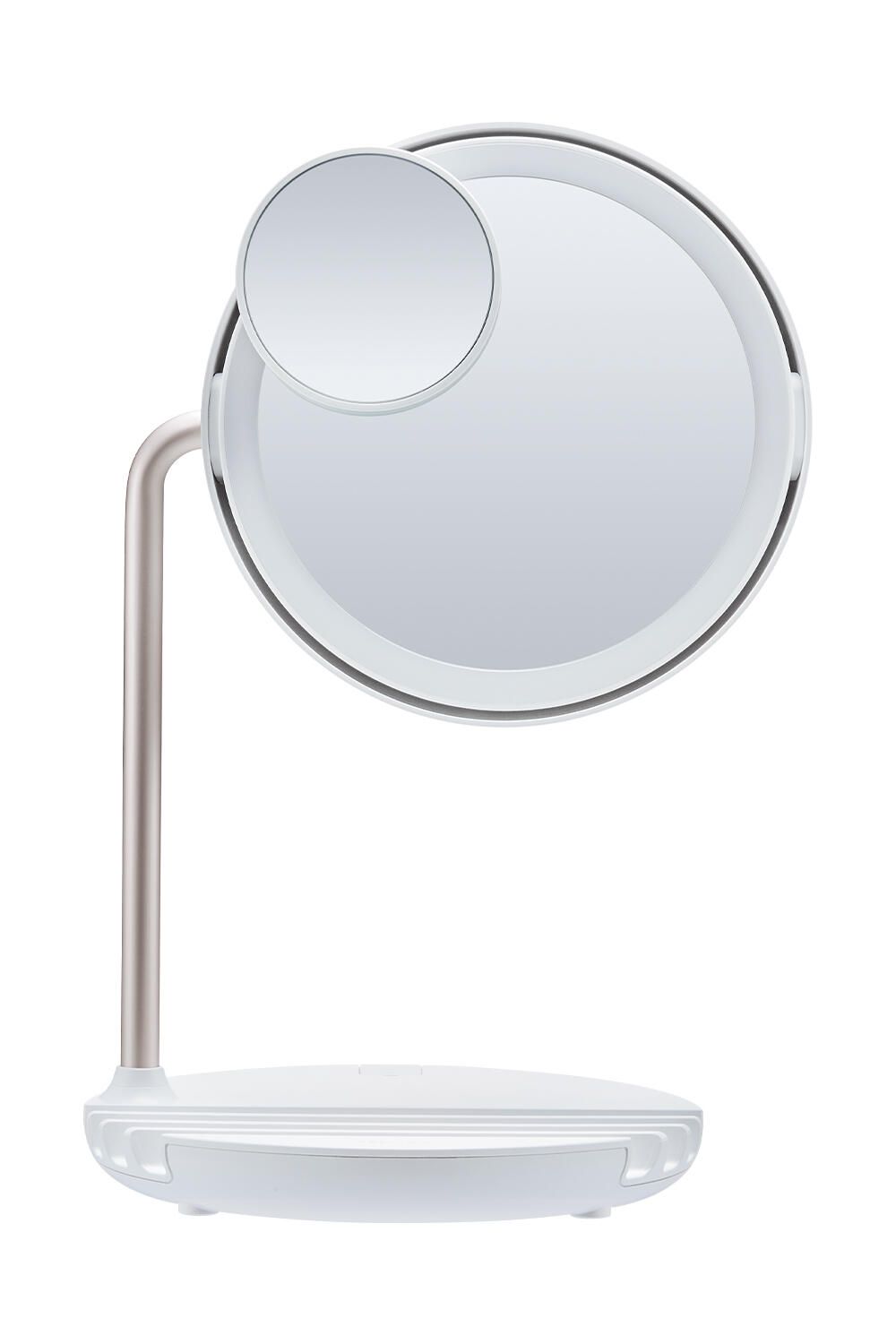 本体はUSBケーブルで充電でき、片手でも持てる軽いサイズなので、使いたい場所に持ち運んで好きな場所でメイクが可能です。ヘッドは180℃回転し角度調整も可能。どの高さに設置しても、顔をしっかり写すことができます。