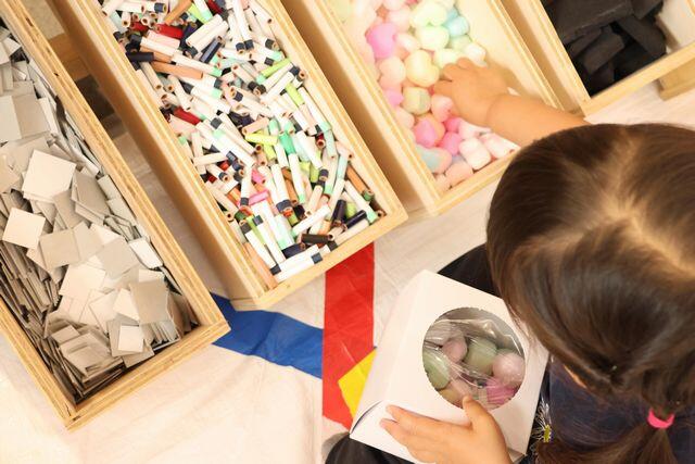 創業240年の紙屋・中庄が取り揃えた豊富な種類の紙、企業から提供された珍しい形の端材・廃材を、カラフルで楽しい道具を使って、図工・創作を楽しむことができます。
