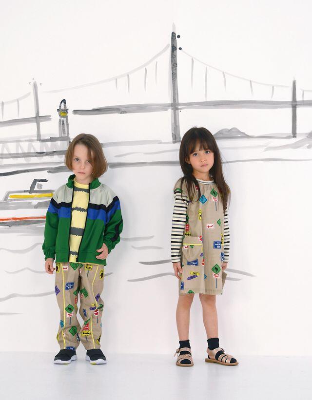 オーストラリアの野生動物に向けた交通標識をPOPなオリジナル総柄にしたパンツとワンピースをリンクコーデの主役に。
