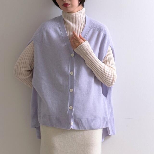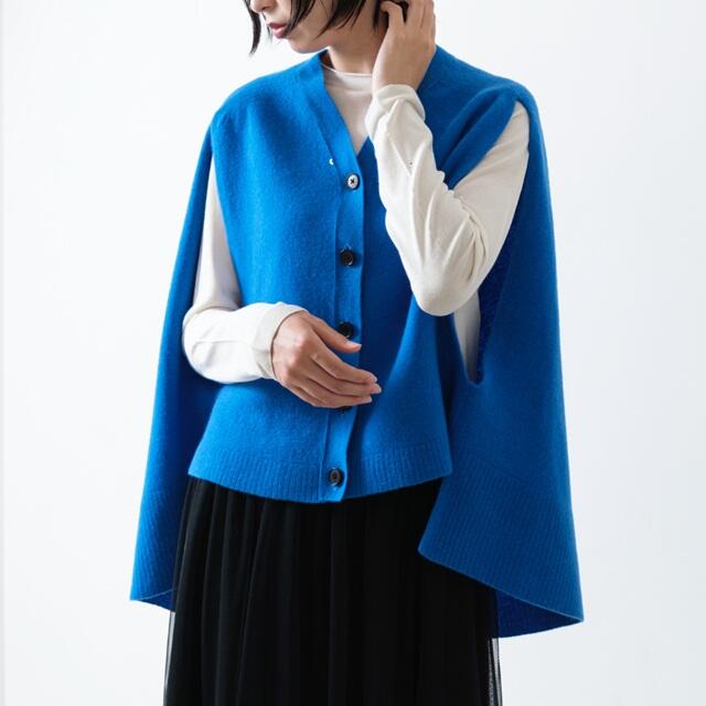 カーディガンを肩にかけた後ろ姿から着想して前開きのベストとポンチョをドッキングししたようなデザインになっています。