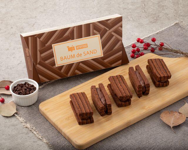 しっとりとしたチョコレート味のバウムクーヘンでチョコチップ入りのチョコクリームをサンドした一品。