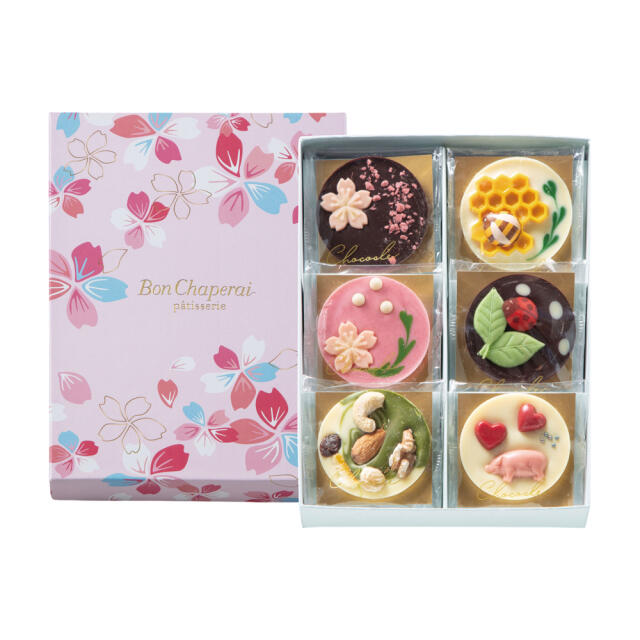 ショコラが魅せる甘い芸術。春限定のさくら、夜桜、抹茶、幸せを運ぶてんとう虫やミツバチたちのモチーフがかわいい詰め合せです。