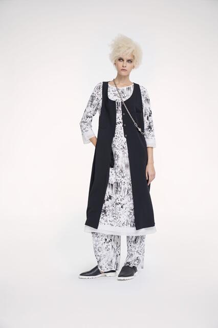 繊細なタッチで描かれたモノトーンプリントが印象的なチュニックワンピース。アートな柄行きがシンプルなシルエットに奥行と個性を添えています。ジャージー素材ならではのしなやかな着心地で、リラックス感がありながら上品さのある一枚。軽やかな羽織として長い期間活躍するモードな雰囲気のロングジレとのレイヤードで、縦のラインが強調され、洗練されたスタイルを表現しています。