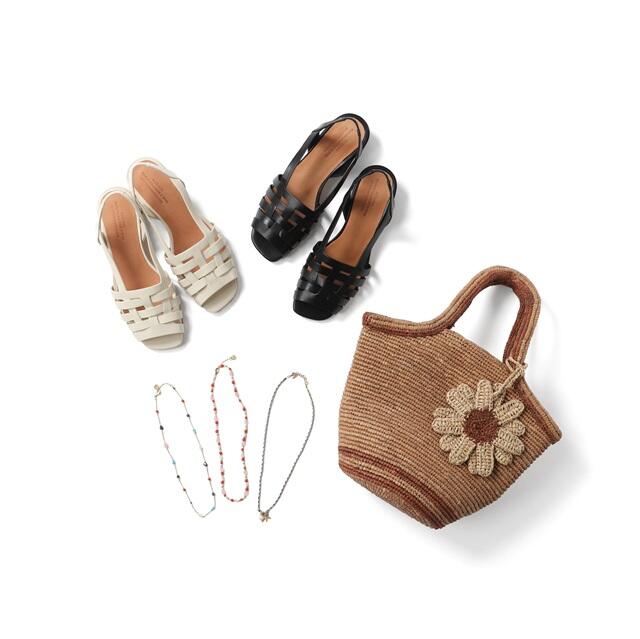 アクセサリーは18金コーティングと手仕上げクリスタルを組み合わせた繊細で華やかなデザインが特徴。バッグはマダガスカルの職人が手編みで仕上げ、自然な風合いです。