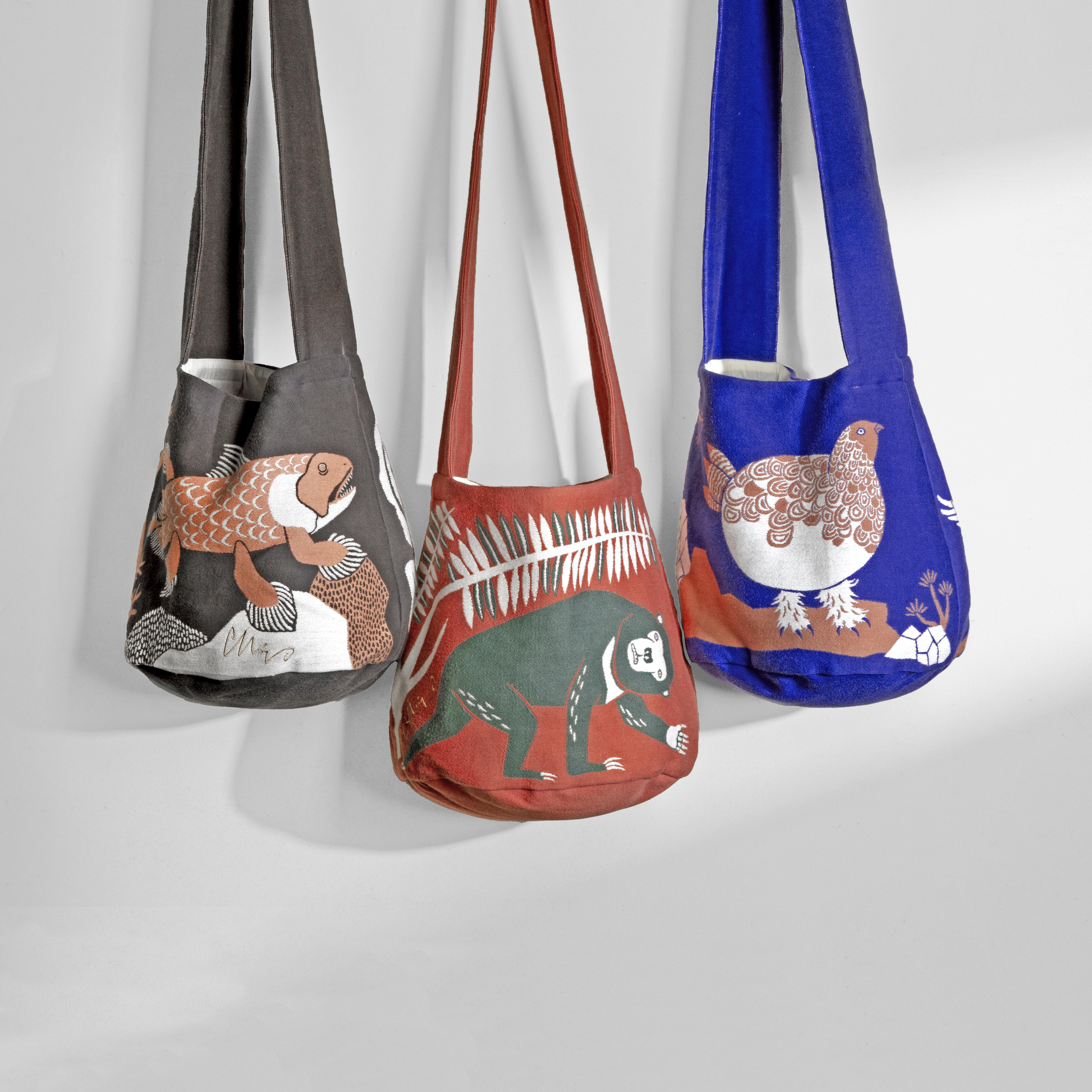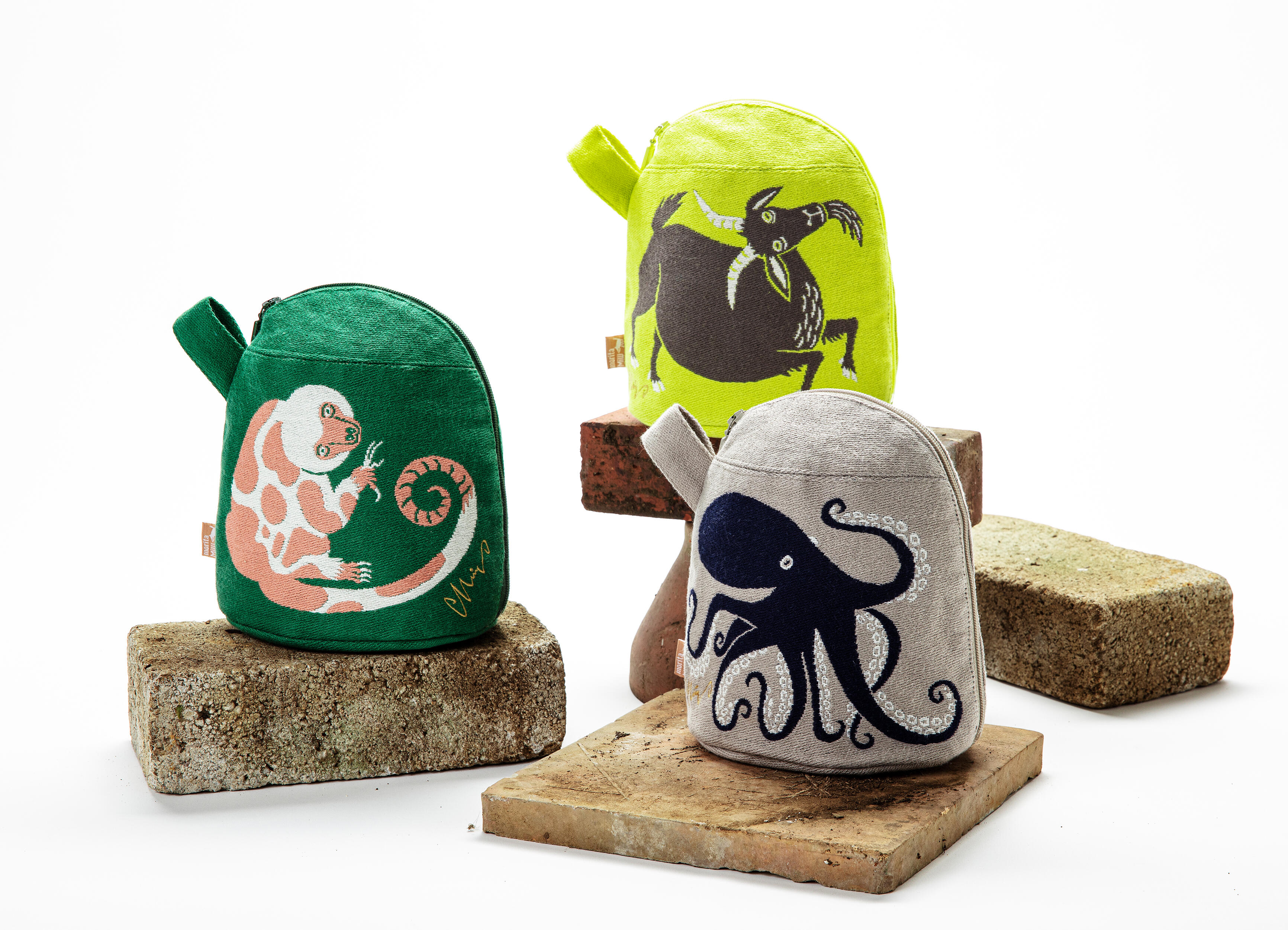 左から『樹枝のシッポのクスクスたち』、『岩山のスキップのヤギたち』、『深海のダンスのタコたち』