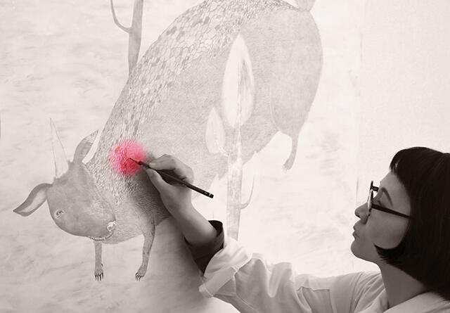 MiWさんの不思議な絵の世界から表裏違う絵でほら、あの子やこの子、大人びた目で生き物たちが話しかけてきます。
