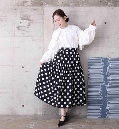 オリジナルデザインプリントの切替タフタスカート。ポルカドット柄がコーディネートの主役に。透け感もなくオールシーズン着用可能です。