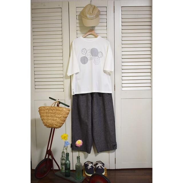 2本で撚り合わせた非常に細い糸を使用した薄手のコットン生地に[コズ]オリジナルアップリケ刺しゅうを施した楽しさと大人のかわいらしさをミックスしたカットソー。
