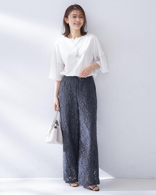 袖部分にシアー素材の切り替えが入ったエレガントな印象のカットソー。身頃部分はコットンなので、暑い季節も活躍すること間違いなし。ワイドパンツはレース素材が印象的なトルコでデザインされた繊細さとアンティークな趣のあるボタニカル柄が特徴で、ストレッチ性も兼ね備え使いやすさも抜群です。