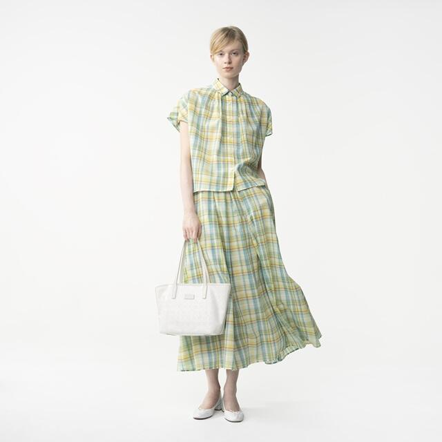 夏の日差しに映える華やかなチェック柄のブラウスとスカート。