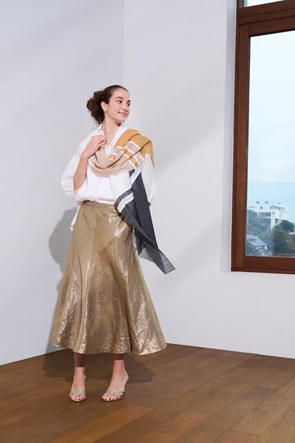 Vあきが大人の抜け感を演出するシアードビーブラウスに、ゴールドのメタリックな輝きが新鮮な存在感のあるスカートをコーディネート。バイカラーのストールをさらりと合わせるのもおすすめです。